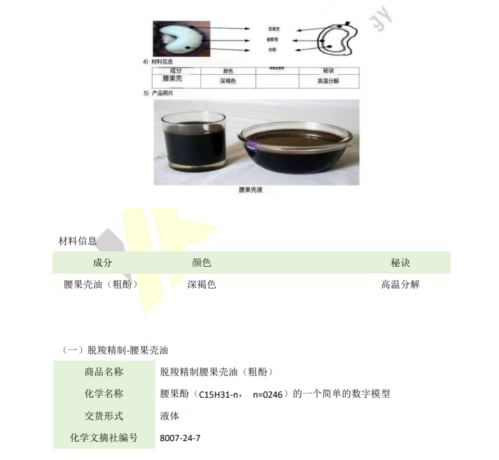 精制腰果壳油是从腰果壳中压榨出来的产品。天然腰果壳油是酚类化合物与脂肪侧链的混合物,其中 70% 是阿卡酸,5% 是角鲨烷,18% 是卡多醇。