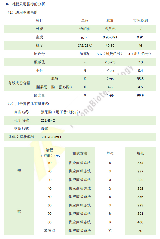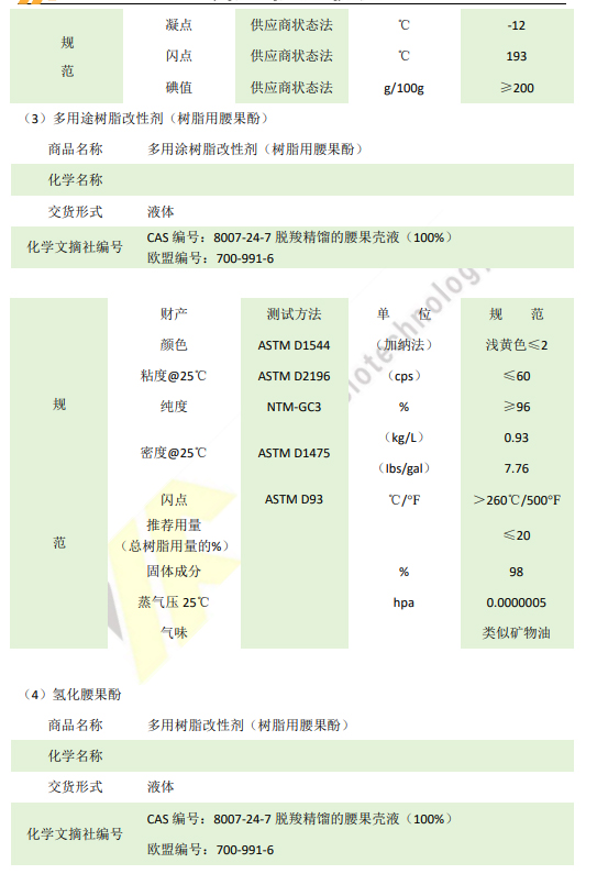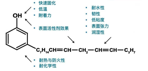 生物降解性:腰果酚是从天然腰果壳中提取的,属于生物可再生资源,具有良好的生物降解性,对环境友好。