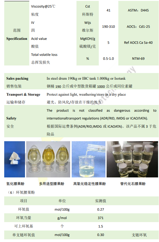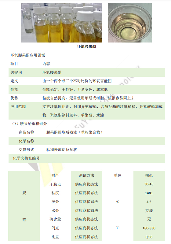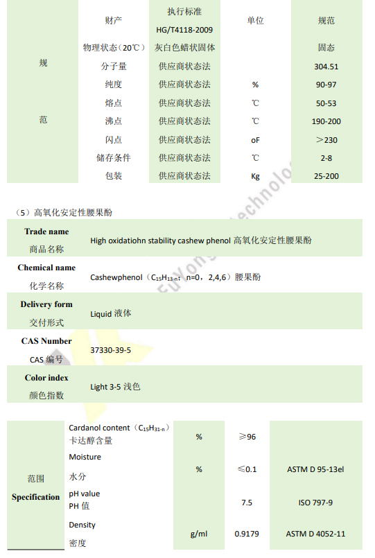 7、腰果酚是环氧固化剂、环氧稀释剂、树脂增韧剂以及多元醇和二元醇的主要原料。这种天然烷基酚材料有一个芳香环,提供了一个强大的化学和耐热主链,而羟基则提供了优异的附着力和良好的反应性,从而达到快速和低温固化。长的脂肪族侧链具有优异的耐水性和防潮性、良好的柔韧性、低粘度、长操作期和优异的防腐性能。我们的腰果酚产品,系列已获得美国农业部认证的生物基产品标签。